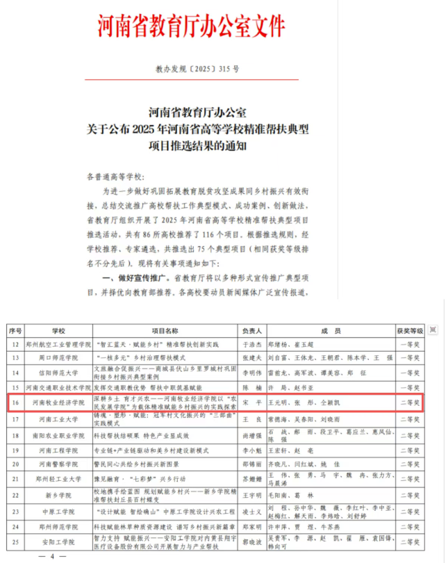 近日,河南省教育厅办公室印发了《M88 APP下载公布2025年河南省高等学校精准帮扶典型项目推选结果的通知》(教办发规〔2025〕315号),M88 APP下载选送的精准帮扶项目《深耕乡土 育才兴农——M88 APP下载,M88 APP 体育以“农民发展学院”为载体精准赋能乡村振兴的实践探索》荣获二等奖。